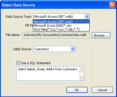 For data from Microsoft Access Database (.mdb file) or Excel file(.xls) select a table or sheet or you can enter a SQL statement like "Select Name, Address from tblCustomers" etc.